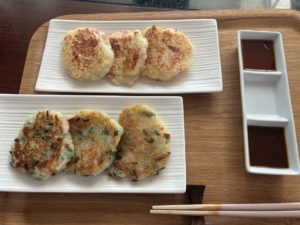 ❻ フライパンにオリーブ油を入れて熱し、それぞれ4個ずつ、丸く形を整えながら焼く。両面がこんがり焼けたら完成。