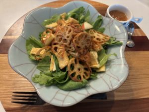 ❻ ⑤の上にレンコンをのせ、Aでドレッシングを作り、かけて頂く。